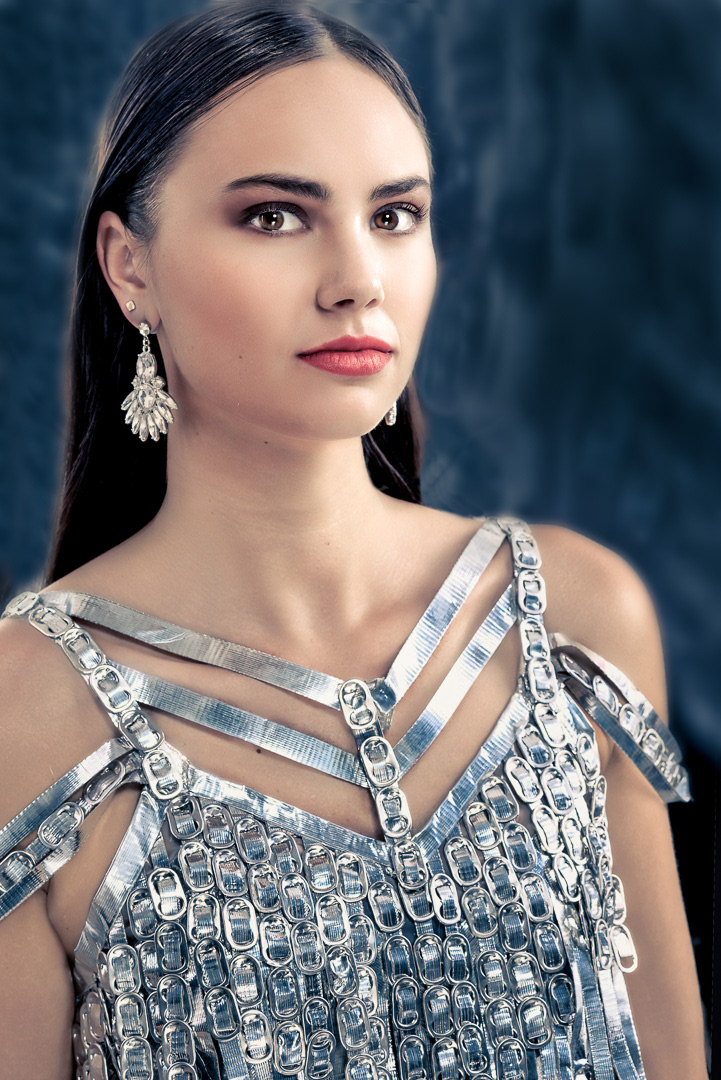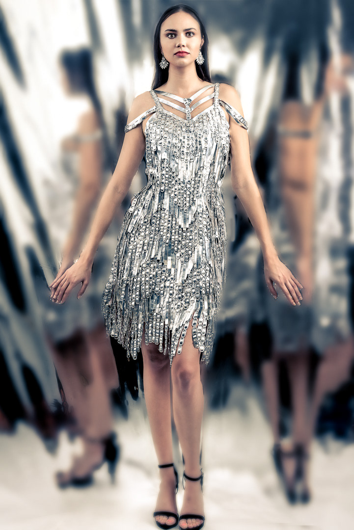 Dress of aluminum can tabs and silver Duck tape by fashion designer Alexis Cook