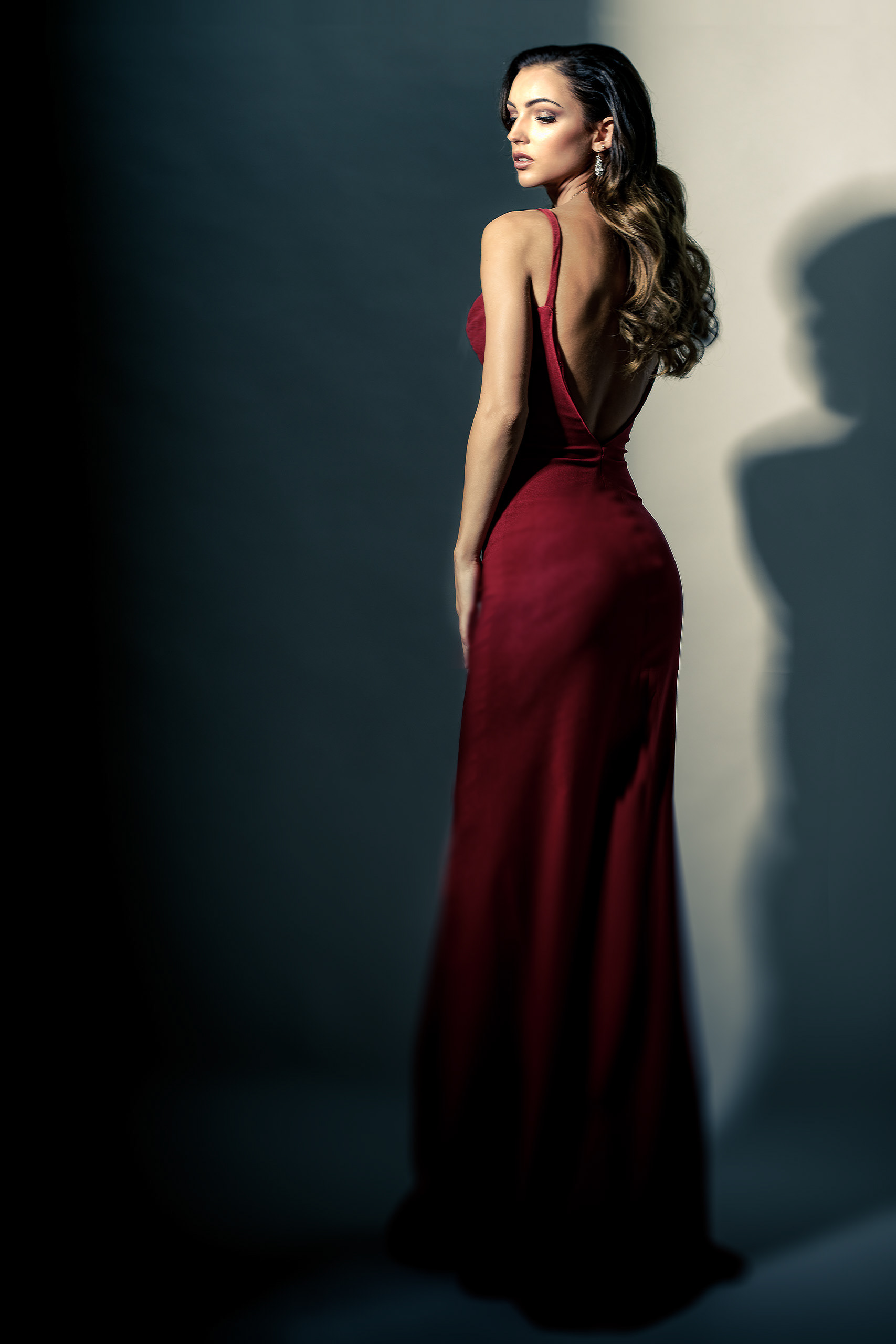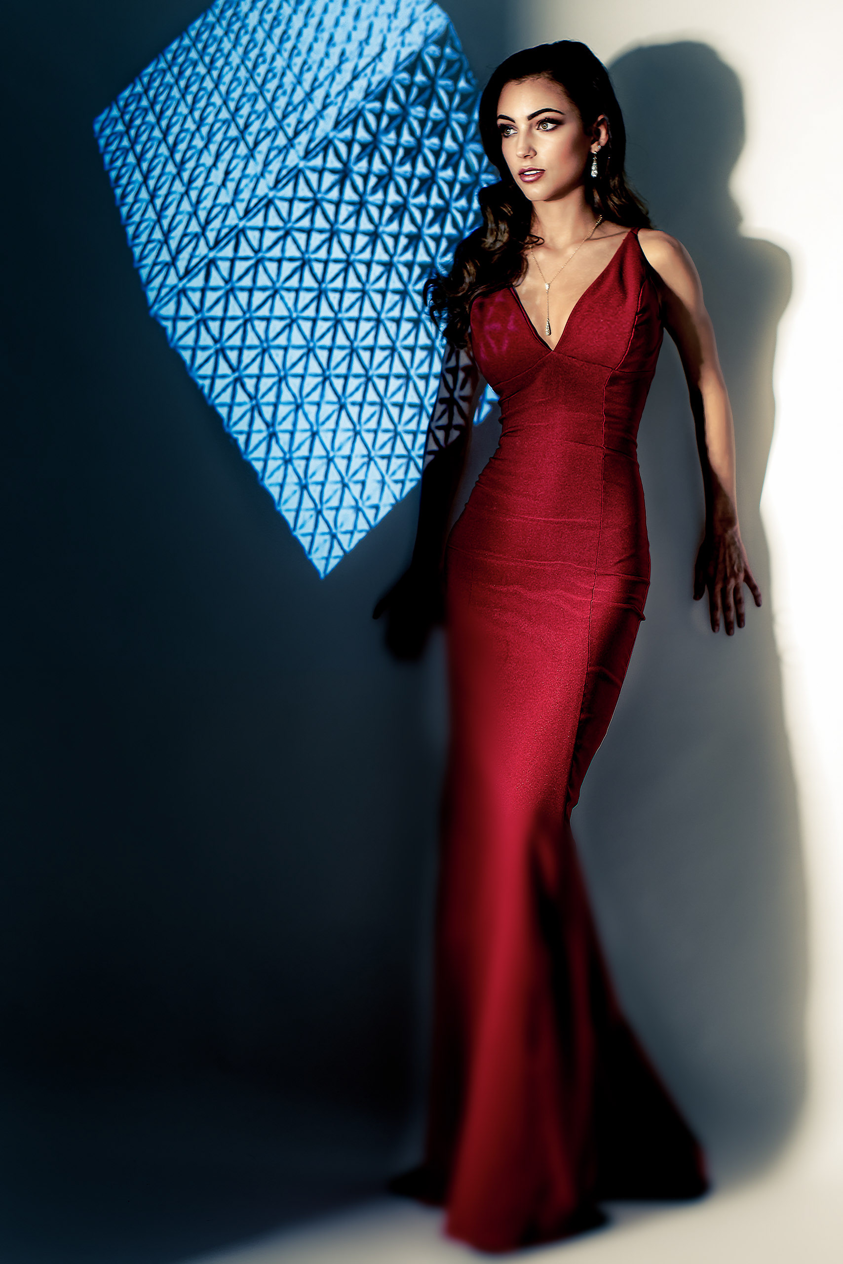 Fashion designer and model Ashley Hassell wears her original design for this series of lighting tests with spotlights and projectors.