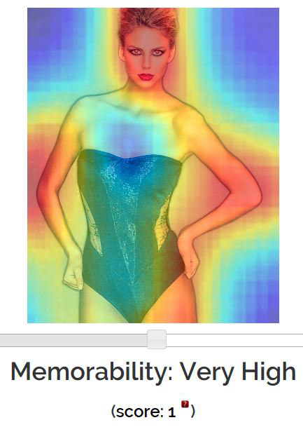 This version update of model Mimi Graczyk wearing a Suzanne Lay body suit gets LaMem's top memorability score. See http://memorability.csail.mit.edu/index.html for more about LaMem.